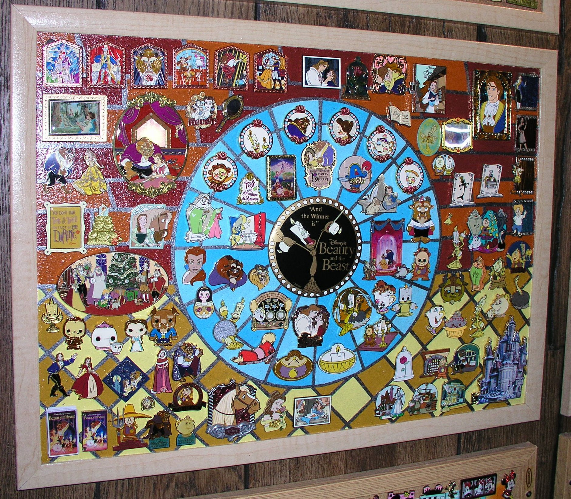 @swim2sea I finally took a quick photo of my Beauty and the Beast board (though I do have some more pins to add to the collection). Sis painted it for me in the style of the "Windows of Love" mystery set, as the stained glass portions of the film are some of my favorite parts. It made a good center for the large button. I'm thinking to move some of the smaller, plainer pins into a book and keep the harder-to-display pins on the board. So many of them are hinged, pin--on-pin, etc. They're harder to keep in a book! I have the Chef Bouche WDI pin and really want to get him up there, but he's BIG! He's my favorite character from the whole movie -- with Prince right behind. There aren't very many pins with Prince on them, but I'm working to get as many as possible. Since this is a collection with so many choices, using the board with three distinct "areas" really helped me give some parameters to the pins. ~ Sarah