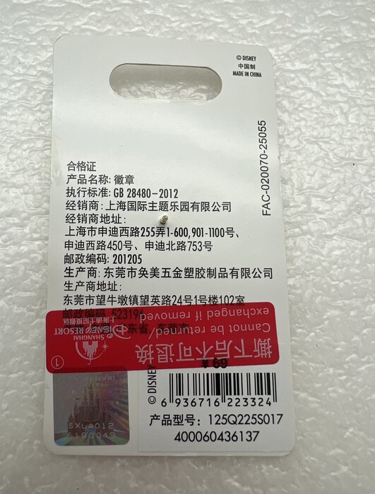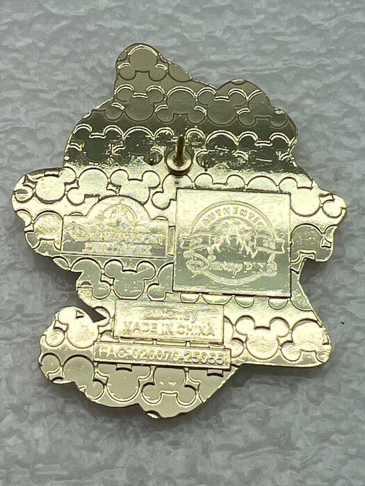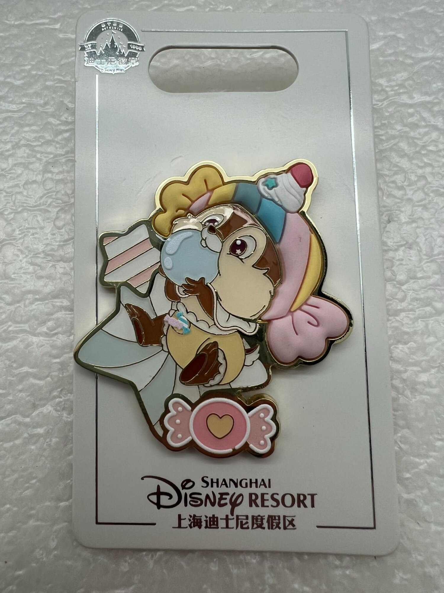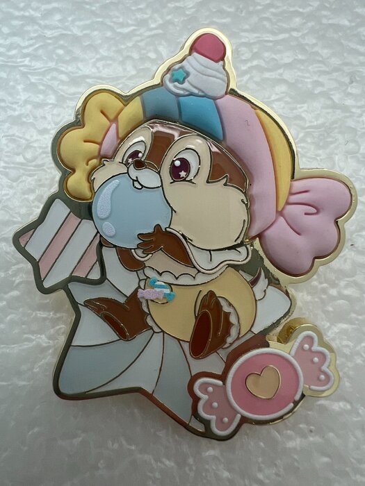 This pin is part of the 4-piece Chip and Dale Cutie Treats set released in April of 2025 by Shanghai Disney Resort. The pin features Chip surrounded by candy confections wearing a 3D rubberized marshmallow candy hat. Back - Gold Mickey head waffle pattern, Single Post, Two Nubs, Authentic Disney Pins 2025 logo, Shanghai Disney Resort logo, ©Disney, MADE IN CHINA, FAC. Series SKU: 6936716223324 Dimensions: 1 3/4” x 2” Original Cost: ¥ 69/set -