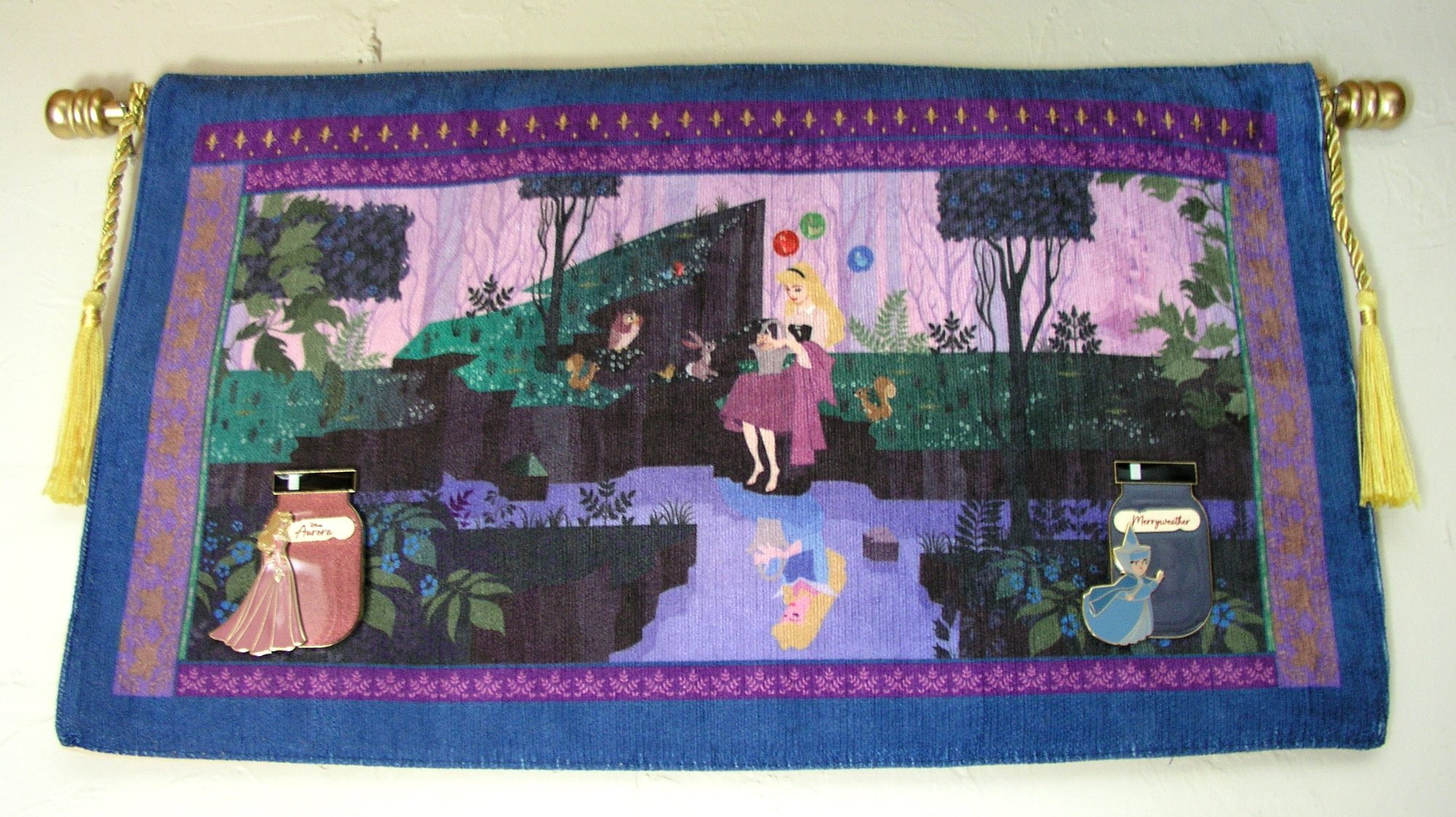 Here's a photo of one of my favorite pin displays, and it's something totally different -- since the pins don't fit into any of my collections. When the Paint Jar pins came out at D23 in 2024, Sis and I loved them. We have gotten the few characters that we really wanted, but my problem was that the two jars I really loved were Aurora and Merryweather from Sleeping Beauty. I don't collect anything from that film! What to do . . . Well, first we got the pins. But what to do with them after that? We got to visit Disney Springs in January 2025, and there was a display in the very back of the The Marketplace Co-op that had just the ticket! It's a decorative tapestry showing Briar Rose at the edge of a stream, where her reflection is Aurora in the blue dress. So, I now have that tapestry hanging in our bedroom with the two paint jar pins on it! ~ Sarah