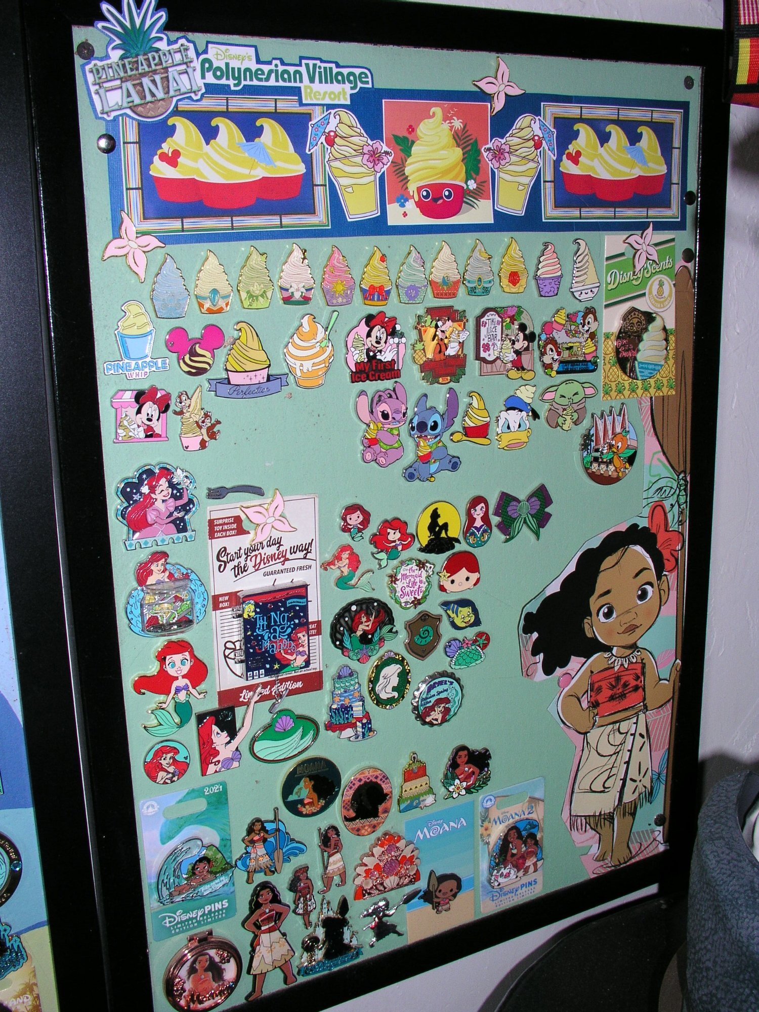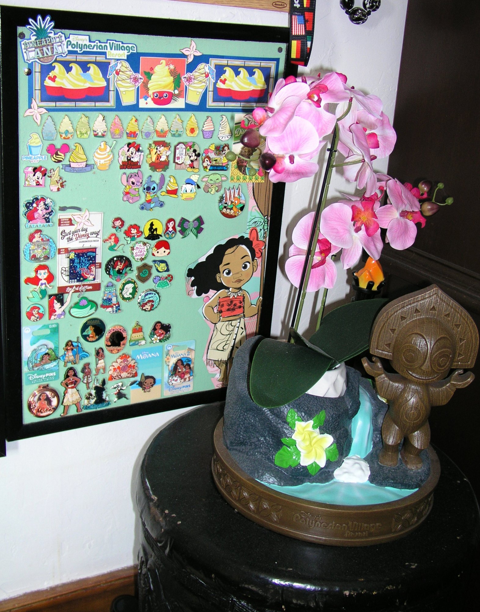 That is a great collection! And I love how you have them in the classic frame. There was an earlier set of Loungefly Princess-themed Soft Serve pins, and I actually have them on my Dole Whip board! They were the first mystery set that I ever "needed" to have complete. Currently, I have a three-board display that houses my Hawaiian/Aulani/Polynesian/Moana/Dole Whip/Ariel collection -- which is my favorite. Here's the part that has the Dole Whip pins, though I'm a bit behind and have a couple more to pin on there. I made the top banner part, because there are no pins representing Pineapple Lanai at the Polynesian Resort -- which is my favorite Dole Whip location. And the large Moana with the oar is actually from the side of an Animators doll box. Worked great for board decor! In 2024, we were thrilled to find a real end table from the Polynesian Resort at Dayton Disneyana (Recycling the Magic was there with amazing stuff), so that sits in front of my board. And the planter there came from Bou-Tiki at the Polynesian. That's another collection . . . the Polynesian Resort tiki statue. Finding a colored fake orchid the right size for the planter was the hardest part! ~ Sarah