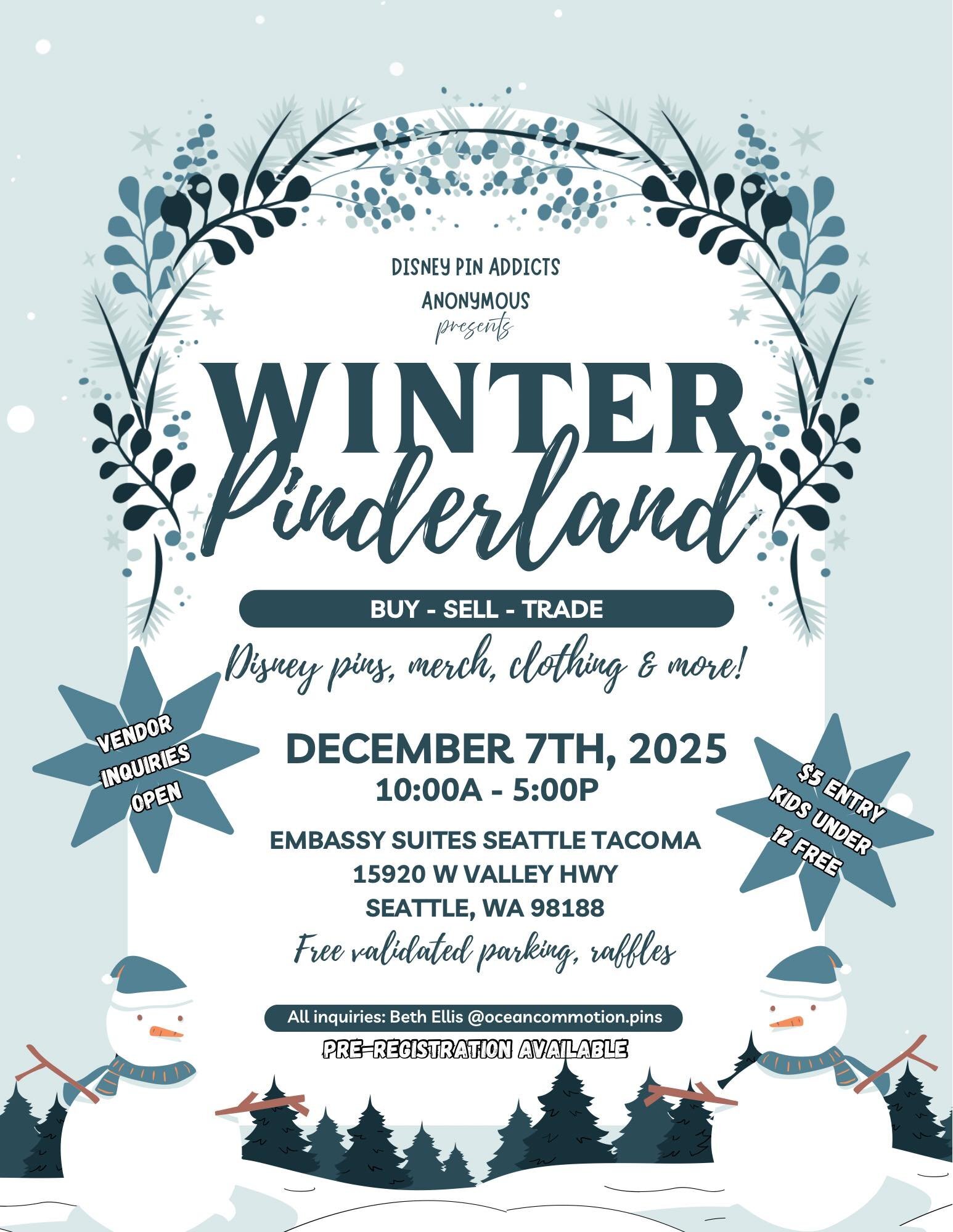 Disney Pin Addicts Anonymous presents Winter Pinderland December 7th 10AM to 5PM Embassy Suites Seattle Tacoma 15920 W Valley Hwy Seattle, WA 98188 $5 entry Kids under 12 free