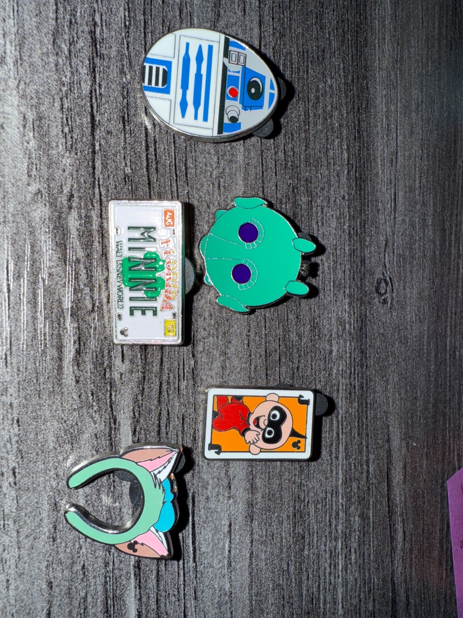 The Minnie Plate is a fake because it is 5 of 11 not 6 of 11. Greedo and the R2-D2 pins have boarders.