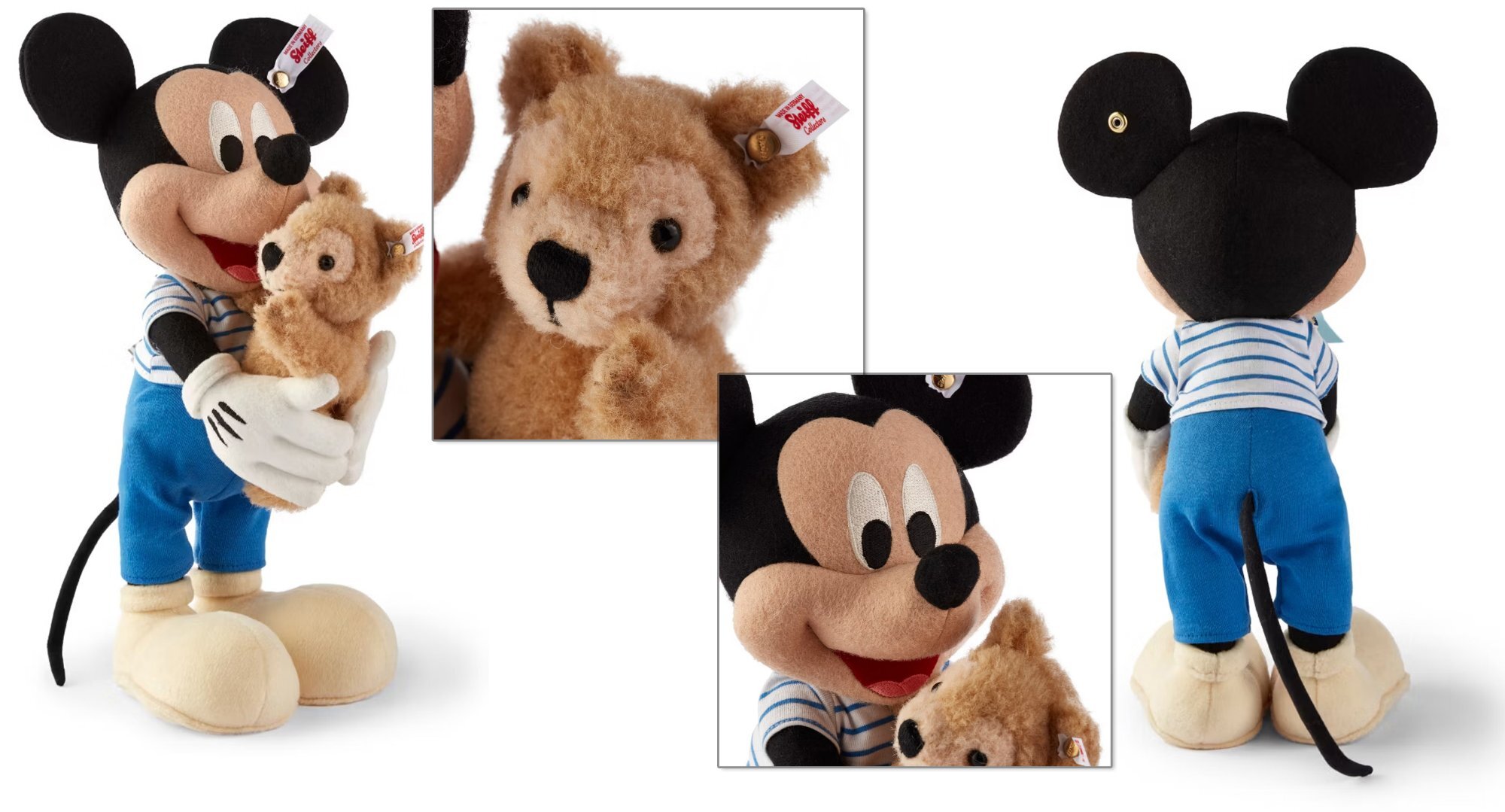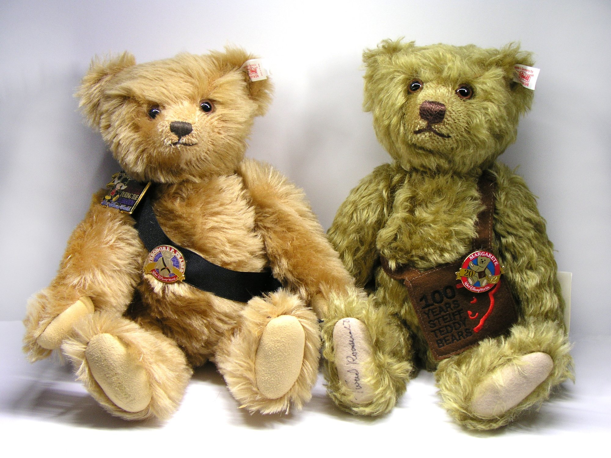 TheTwins Posted yesterday at 06:02 PM Posted yesterday at 06:02 PM The collecting bug has a way of biting you, as all of us who collect pins understand so well. And when you collect things, it’s rarely confined to just one collection or one type of item. Most of us can lay claim to at least one other collection, and Disney has collaborated with a number of other brands over the years to offer enough fun merchandise to fill our houses with fun and cheer. Every now and then, those collaborations spill over into matching pins. Today, we’re going to explore the combined love of pins with another great collectible – plush. And not just any plush. Steiff plush. Steiff and Disney have had a long-standing partnership, and you can still enjoy park-exclusive pieces at Der Teddybar in World Showcase at the Germany Pavilion. Did you know that the first Steiff Mickey debuted in 1931, with Minnie following in 1932? These velvet wonders are a bit gangly looking when judged by modern standards (get a load of Minnie’s droopy whiskers), but it’s fun to imagine just how many Christmas trees in 1931 and 1932 had these hiding under them. While they don’t quite resemble the cute stuffies we’re used to now, they were a hit in their day! Mickey sold 30,000 pieces in no time flat. And if you watch the early cartoons, Mickey and Minnie did look a lot like these originals, though the yellow gloves are a bit different! Early plush and toys have featured on a number of pins over the years, including PP#1103 and PP#1104, some early real-cloisonne beauties that are quite similar to the plush above (and definitely on my wants list). Recently, we’ve seen some much cuter Steiff Mickey plush renditions hit the shelves. When Duffy Bear came to WDW as a character in 2010 (having been in the Asian parks for some time already), PP#81338 was released at Disney parks around the world. It featured Captain Mickey holding his beloved Duffy Bear. The pin is super cute, and just look how amazing the same idea can be in plush! Steiff released this Mickey and Duffy special in 2024. Don’t you just want to stroke mini-Duffy’s cheek?! A lesser-known pin is PP#117872, an Adventures by Disney special that guests on a certain tour received after visiting the Steiff Museum in Germany. Again, Steiff released a plush echoing the design – only this time Mickey and his bear were released in honor of the Disney100 celebration in 2023. Sis and I were born in the prime era for plush. If you grew up in the 1990s or 2000s, then the world of cuddly animals was yours. We fell for it hook-line-and-sinker and are still plush nuts. (Trying to remember if we’ve managed a trip to Disney where we did not come home with a new plush . . . nope . . . don’t think it’s happened yet.) Well, you’re never too old for a teddy bear, and this Christmas Mom and Sis made one of my plush dreams come true! Meet Theodore P. Trader and Margarete. These beautiful bears were made by Steiff as Limited Edition releases for the Teddy Bear and Doll conventions at Walt Disney World in 2000 and 2002 respectively. If you were active in the pin community at this time, you might even remember Larry of Dizpins.com who took his Theodore to WDW on various adventures and blogged (from the bear’s perspective) about them in some very entertaining posts. Theodore (PP#60426) was released in October 2000, at WDW's 13th Annual Teddy Bear and Doll Convention, as a limited edition of 1,500 with a hefty $270.00 price tag. Disney pin trading was just turning a year old at the time and was one of the hottest things the Resort had to offer, making a pin-trading bear a natural choice for Steiff’s exclusive convention release. He sported several pins, including his exclusive PP#3180 – which was the first Steiff exclusive Disney pin! Margarete (PP#60766) was released two years later at the 15th Annual TB&D Convention, also a limited edition of 1,500, but with a slightly smaller price tag of $250.00. She was considered a cousin of Theodore (the other cousin, Seymore PP#60765, having been released in 2001), but I can't find that she had a storyline or character released at the time. She resembles the construction of the very early teddy bears and came with a little bag that featured the logo for 100 Years of Steiff Bears and had PP22818 attached to the front. Both bears are made of “mohair”, being a mix of wool and cotton. They’re stuffed in the very firm old-fashioned manner (used to be sawdust but it’s 100% acrylic in these cuties) and feature the famous Steiff “growler” sound when you tip them forward or back. While Theodore and his cousins have to rate as some of the most unique offerings in the Steiff x Disney releases, there are certainly some more great choices. The TB&D events continued through 2008, with special pins appearing each year. In 2006 and 2007, two fabulous releases were showcased; Mickey and Minnie holding their own Disney Bears. They’re so completely irresistible that the TB&D pins for those years feature matching designs. Well, maybe their irresistibility isn’t the reason for the matching designs, but it should be! Even though the Teddy Bear conventions ended in 2008 (which also marked the end of Steiff exclusive Disney pins), the magic of pins and plush has continued on. In fact, a brand-new LE Duffy Bear by Steiff has just debuted at Der Teddybar and on the new DCL ship Adventure. I can't really find photos of it anywhere, but it's shown up in a YouTube walkthrough by one of our favorite channels. You can see Duffy by clicking here. Apparently, he'll be featured in the "Duffy and Friends Shop" aboard the Adventure. To wrap up, here’s a picture from last year that shows Sis and me in the Germany Pavilion just after purchasing mini Steiff “Fynn” bears . We bought them to make little Theodore P. Trader bears for our 18” American Girl dolls. All we need to do is make a little pin lanyard for them, and voila! If anyone here rem